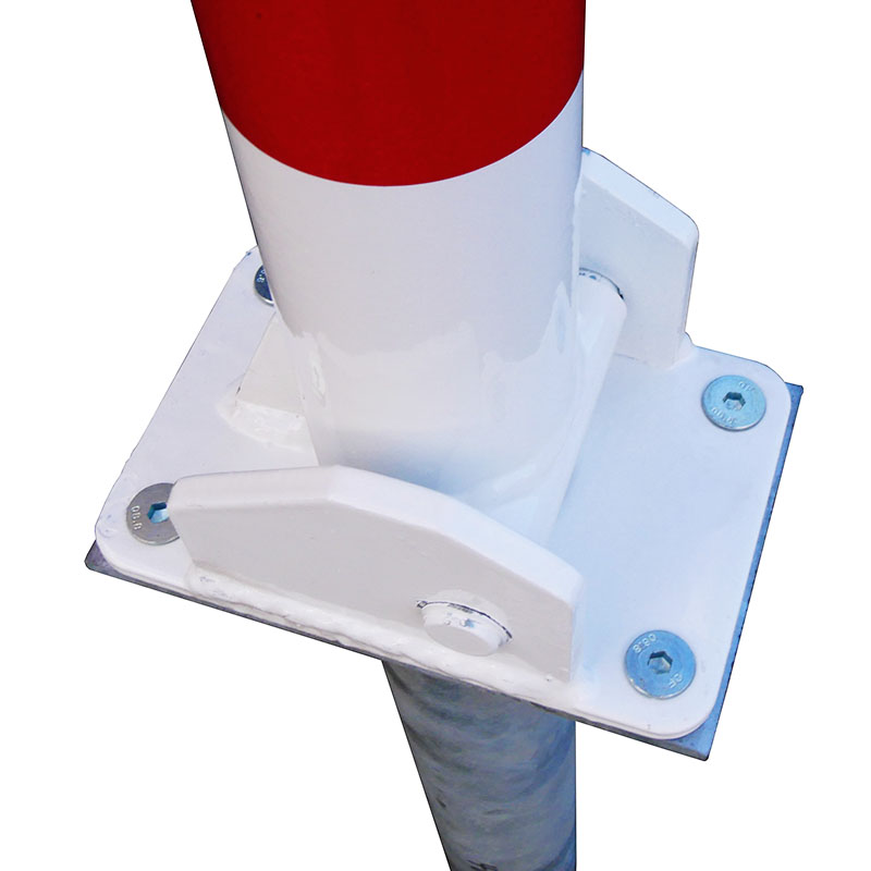 Zur Anbringung sind die umlegbaren Absperrpfosten mit einer Bodenhülse zum Einbetonieren oder einer Bodenplatte 100 x 150 mm zum Aufdübeln ausgestattet. Um sicherzustellen, dass die Pfosten nicht unerlaubt entfernt werden, sind sie mit einem Dreikantverschluss DIN 3223 ausgestattet. So können Rettungskräfte die Absperrpfosten mit einem Dreikantschlüssel M12 schnell umlegen.
