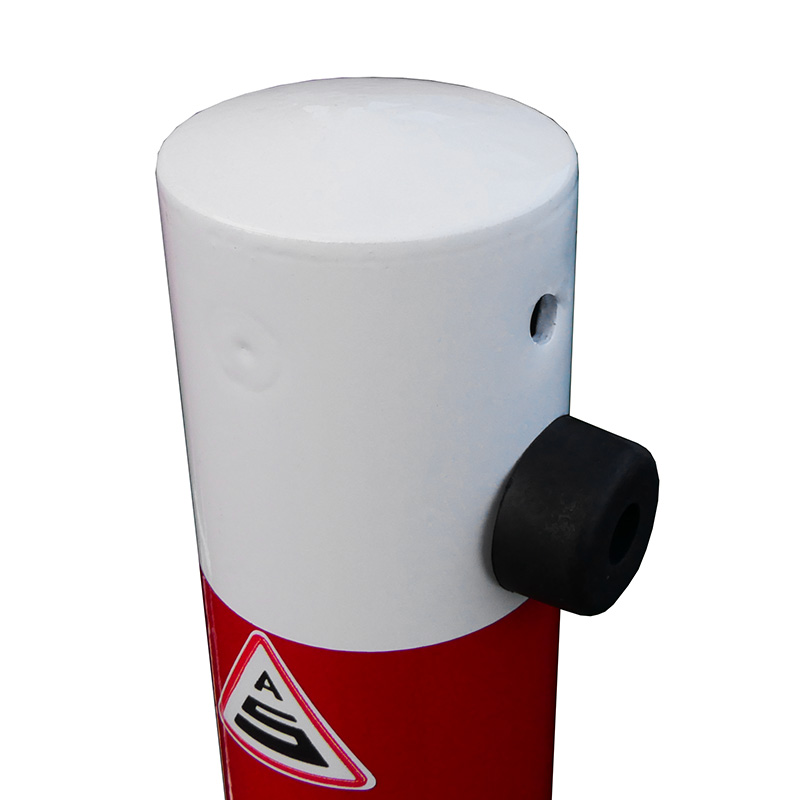 Die rot-weißen Absperrpfosten können auch mit Ösen bestellt werden, um Absperrketten zwischen ihnen anzubringen. Eine oder zwei Ösen sind dabei seitlich angeschweißt.