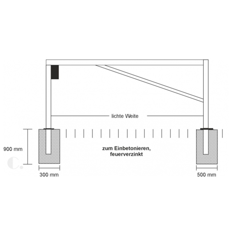 Zum Einbetonieren der Drehschranke mit Auflagepfosten empfehlen wir für die Hauptstütze eine Fundamentgröße von 550 x 550 mm Breite und eine Tiefe von 900 mm. Für den Auflagepfosten sollte das Fundament in 400 x 400 mm Breite und 900 mm Tiefe hergestellt werden. Die Angaben sind ohne Gewährleistung.