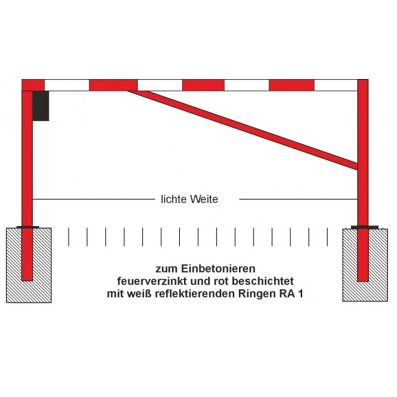 Die Drehschranke mit 2 Auflagepfosten ist in unserem Shop in fünf unterschiedlichen Breiten mit einer lichten Weite zwischen 2500 und 4500 mm bestellbar.