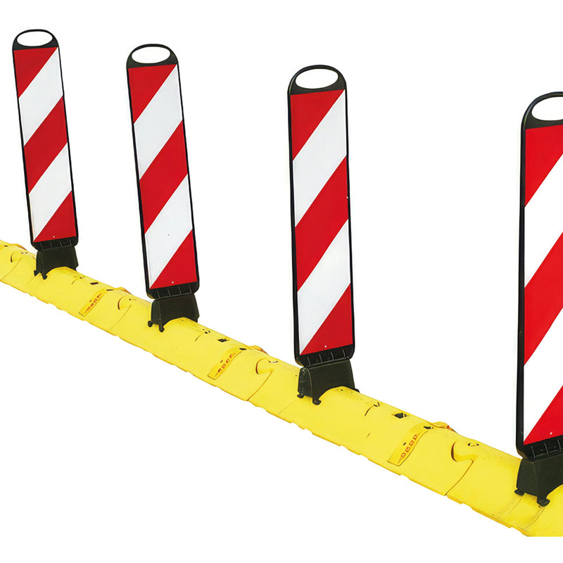 Mittelelemente: Die Mittelelemente sind 1000 mm lang und haben an einer Seite eine Nase, an der anderen eine Aussparung zur Verbindung mit weiteren Elementen. Neben verschiedenen Aufnahmen für kleine Leitbaken und die Tornado Flex Modelle haben sie 2 Reflektorelemente für eine bessere Erkennbarkeit auch im Dunkeln.