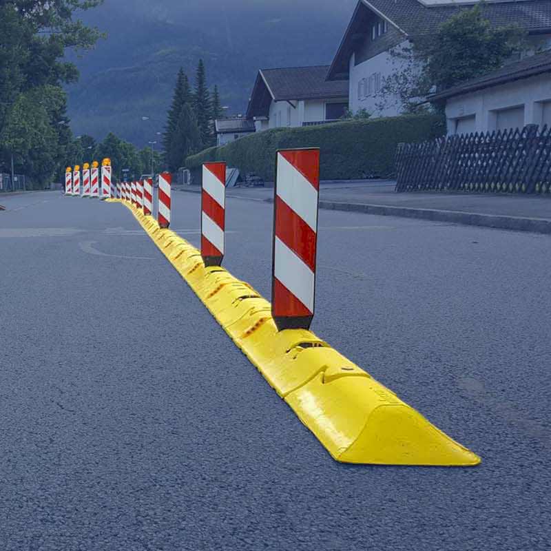 Die gelben Quick Marker Elemente lassen sich auch in Kurven bis zu 90° verlegen. Sie sind mit kleinen Leitbaken, Tornado 75-Flex und Tornado 50-Flex kombinierbar.