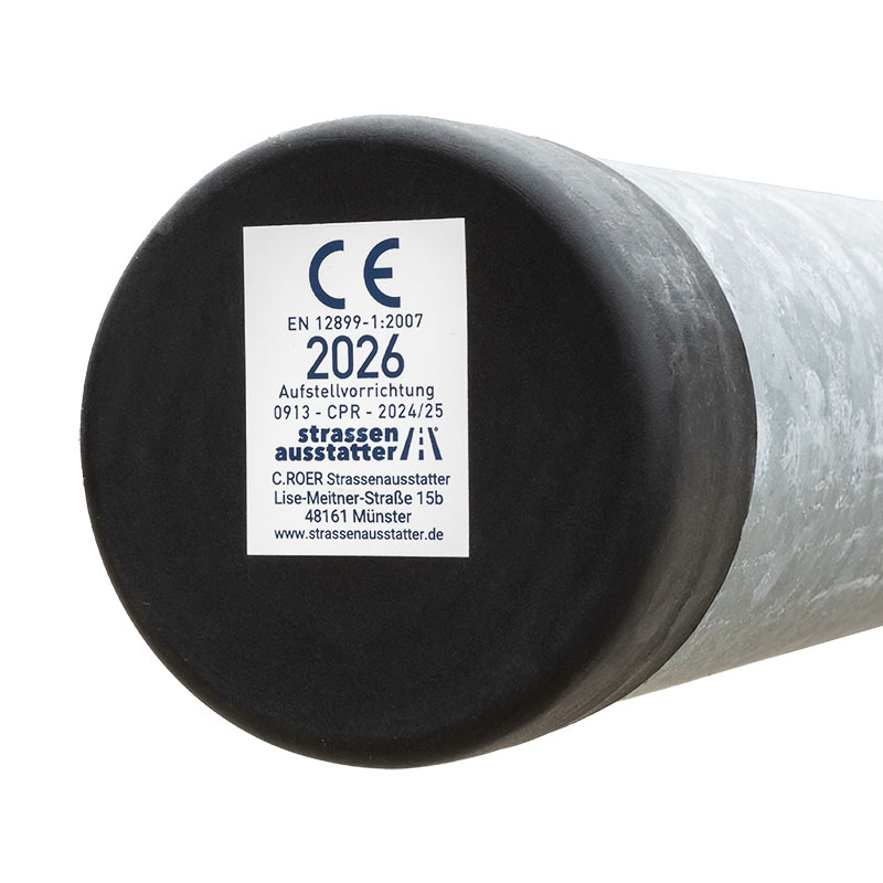 Der hochwertige Pfosten ist mit einem CE-Zeichen ausgestattet. Gegen das Eindringen von Wasser und Schmutz liegt jedem Pfosten eine Rohrkappe aus Kunststoff bei.