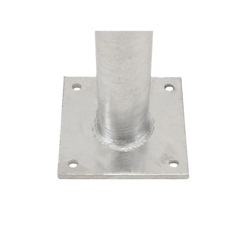 Die Befestigungsplatte aus Stahl mit den Maßen 150 x 150 mm und 8 mm Stärke verfügt über 4 Lochungen Ø 11 mm. Damit lassen sich die Pfosten fest und kippsicher auf- und andübeln.