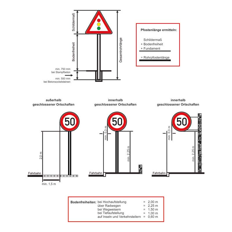- Die benötigte Länge des Rohrpfostens ergibt sich durch Addition von Schildhöhe, Bodenfreiheit und Fundamenttiefe.