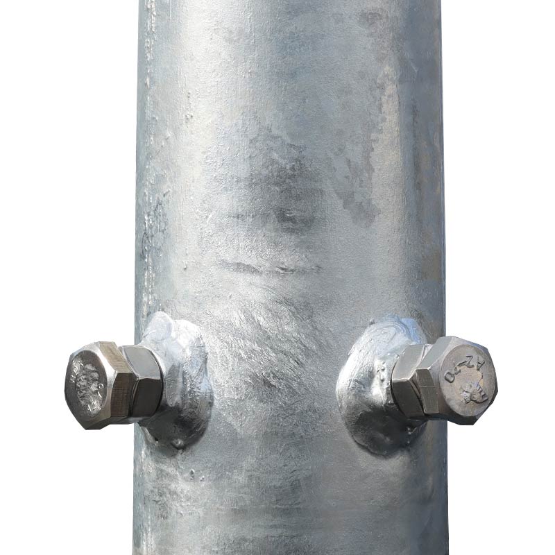 Das Aufsatzrohr mit Stellschrauben am angeschweißten Rohrrahmen 600 x 600 mm wird auf den fest einbetonierten Stahlrohrmast Ø 60 mm aufgesteckt und angeschraubt.