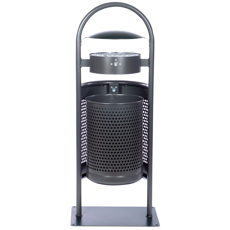 Der Standabfallbehälter aus der Baureihe 7031 ist mit einem Ascher sowie einem Dach ausgestattet, er bietet Platz für 50 Liter Abfälle. Das stabile Ständerwerk aus Stahlrohr und die Rückwand aus gelochtem Stahlblech schützen den Abfallbehälter vor Vandalismus.