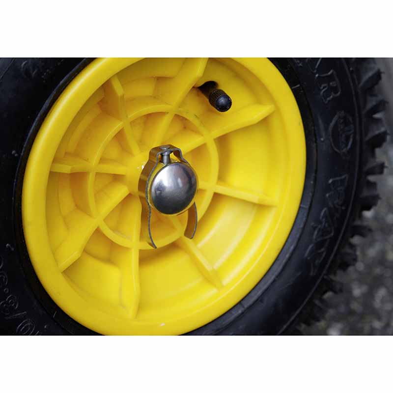 Für eine ergonomische Fahrweise sorgt die Edelstahlschubstange die in 3 verschiedenen Längen und stufenlos in der Höhe eingestellt werden kann. Die großen luftbefüllten Reifen (Durchmesser: 300 mm) haben ein grobstolliges Profil und bewegen sich sauber über fast jedes Gelände. Die Räder lassen sich zudem gegen Wegrollen sichern.