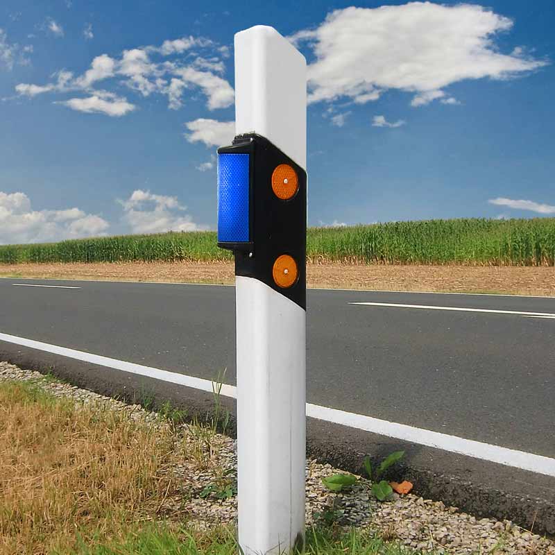 Die blauen Wildwarnreflektoren halbrund reflektieren das Scheinwerferlicht vorbeifahrender Autos in die Randbereiche der Landstraßen. Sie werden straßenabgewandt an Leitpfosten angeschraubt.