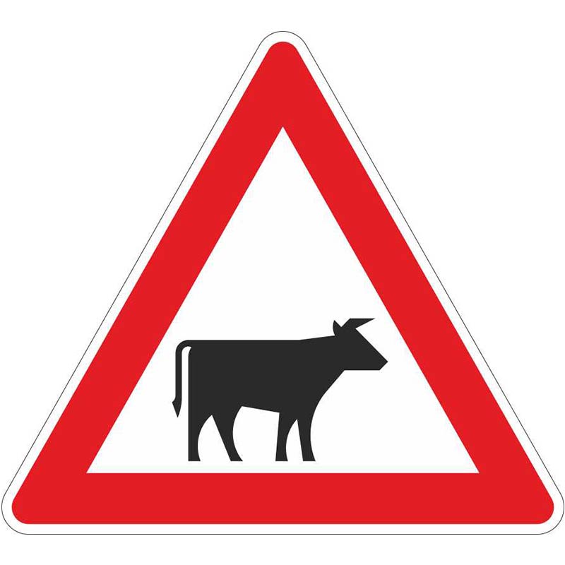 Das Verkehrszeichen 101-22 „Viehtrieb, Aufstellung links“ warnt an schnell befahrenen Straßen davor, dass häufig Tiere die Fahrbahn überqueren oder an dieser entlang getrieben werden.