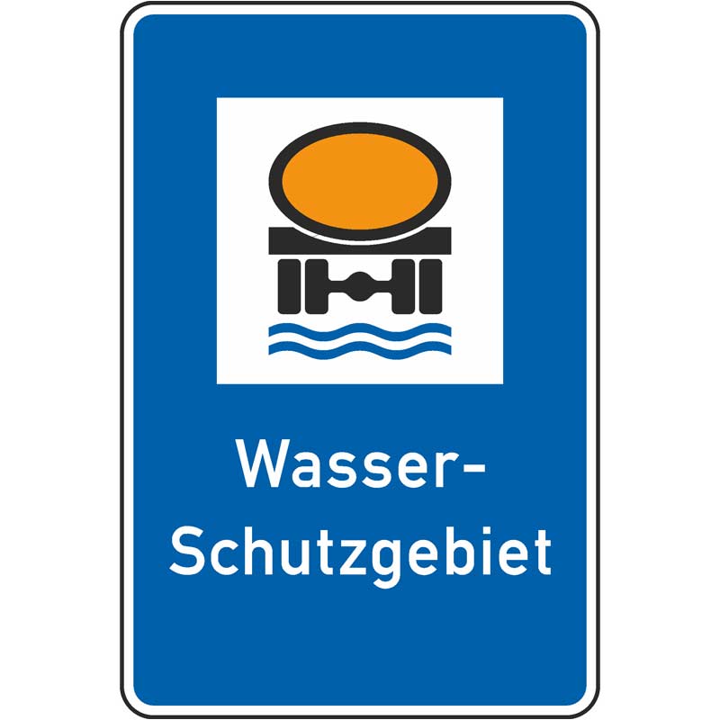 Das Verkehrszeichen 354 „Wasserschutzgebiet“ ist ein rechteckiges, hochkant aufzustellendes Verkehrsschild mit blauem Grund. Oben zeigt ein weißes Feld das schwarz-orangefarbene Gefahrensymbol eines Tankfahrzeugs und zwei blaue Wellenlinien als Wassersymbol. Darunter steht der weiße Schriftzug „Wasser-Schutzgebiet“.