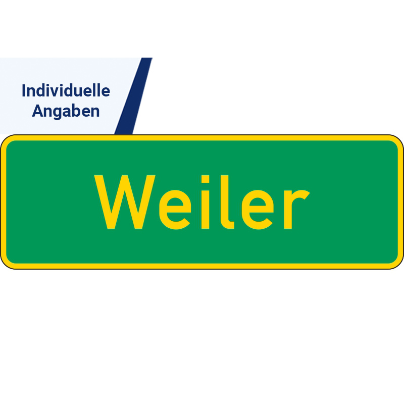 Das Verkehrszeichen 385 „Ortshinweistafel“ ist ein rechteckiges, horizontal anzubringendes Hinweisschild mit einer festen Größe von 350 mm (Höhe) x 1050 mm (Breite). Es ist grün mit gelbem Rand und gelber Ortsbeschriftung. Bitte machen Sie Ihre individuellen Ortsangaben für die Beschriftung!