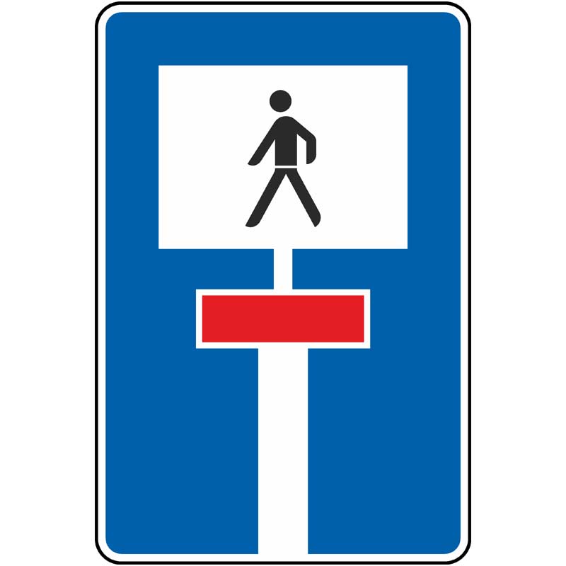 Das Verkehrszeichen 357-51 „Für Fußgänger durchlässige Sackgasse“ ist ein rechteckiges Verkehrsschild mit blauem Grund, das vertikal montiert wird. Oberhalb des rot-weißen Sackgassensymbols ist ein weißes Feld mit dem Piktogramm eines Fußgängers in Schwarz integriert.