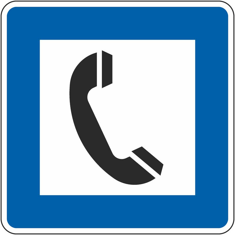 Das Verkehrszeichen 365-50 „Fernsprecher“ ist ein quadratisches Hinweisschild mit blauem Rand. In der weißen Mitte ist ein schwarzer Telefonhörer als Symbol für ein Telefon abgebildet.