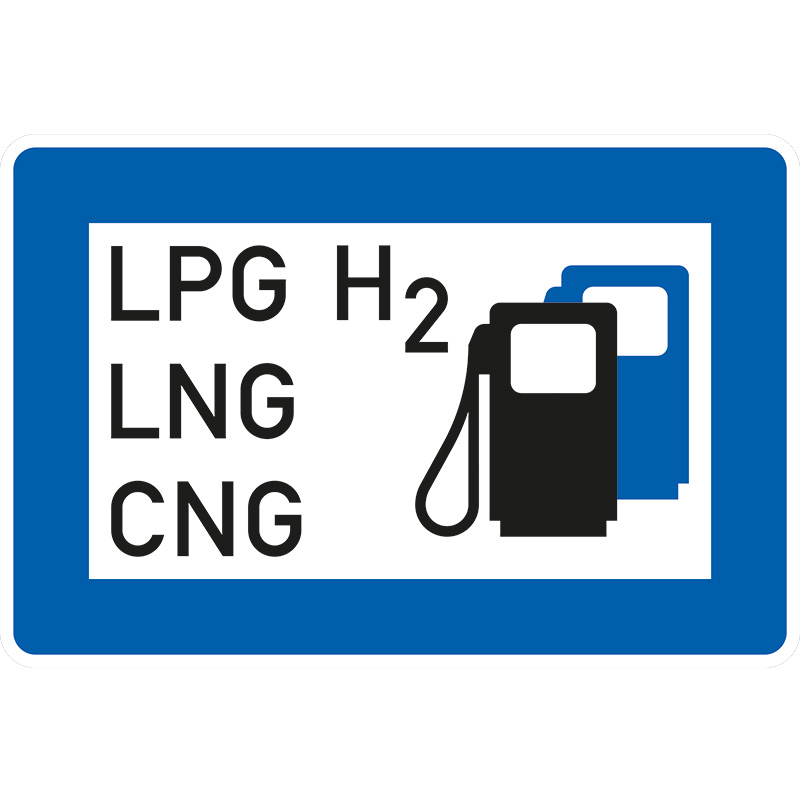 Das Verkehrszeichen 365-71 „Tankmöglichkeit alle Kraftstoffarten“ ist ein rechteckiges Schild mit blauem Rand und weißer Mitte. Es zeigt rechts eine schwarze, dahinter eine blaue Zapfsäule sowie links die Aufschriften „LPG“ (Liquefied Petroleum Gas), „LNG“ (Liquefied Natural Gas), „CNG“ (Compressed Natural Gas“) sowie „H2“ (Wasserstoff).