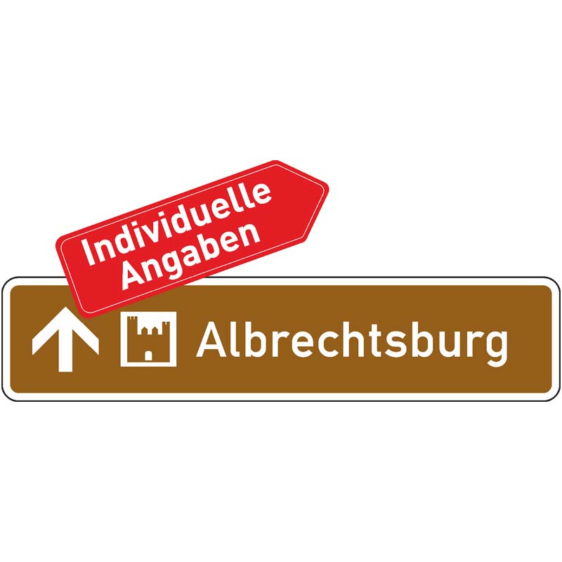 Das Verkehrszeichen 386.1-30 „Touristischer Hinweis als Vorwegweiser, geradeaus“ ist ein rechteckiges Verkehrsschild in Braun mit weißem Rand und weißer Beschriftung: Außen links ein weißer, nach oben zeigender Pfeil, dann das Sinnbild des touristischen Ziels sowie die Bezeichnung. Die genaue Ausführung richtet sich nach den RtB (Richtlinien für die touristische Beschilderung). Bitte sprechen Sie uns an, damit wir Ihre konkreten Angaben zu Ausführung und touristischen Hinweisen aufnehmen können!