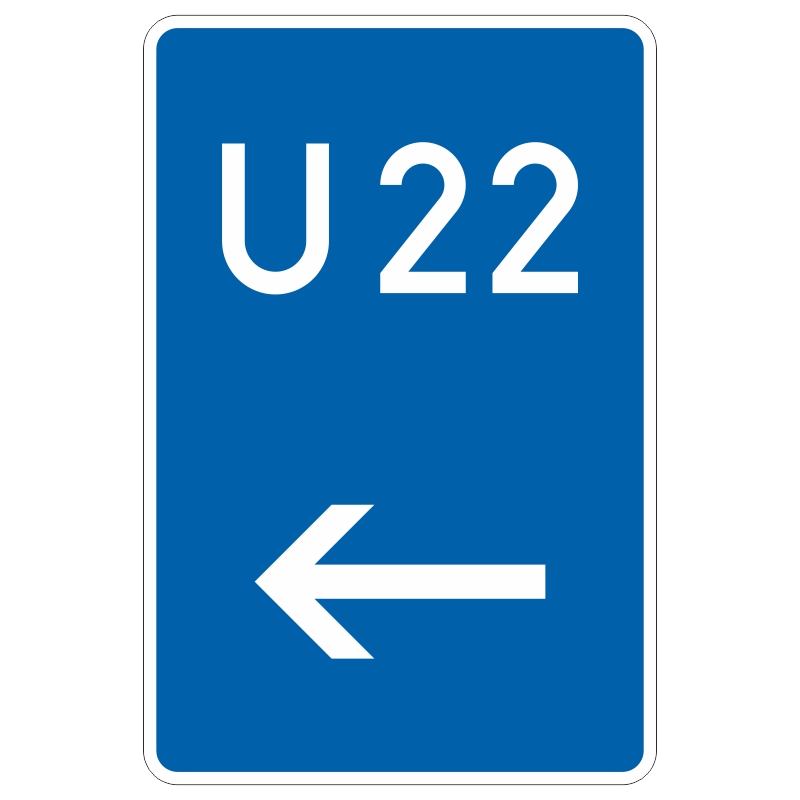 Das Verkehrszeichen 460-11 „Bedarfsumleitung hier links“ ist ein blaues Richtzeichen mit weißer Beschriftung. Das rechteckige Schild zeigt oben ein großes „U“ und rechts daneben die Umleitungsnummer, darunter ist ein horizontal nach links weisender Pfeil abgebildet.