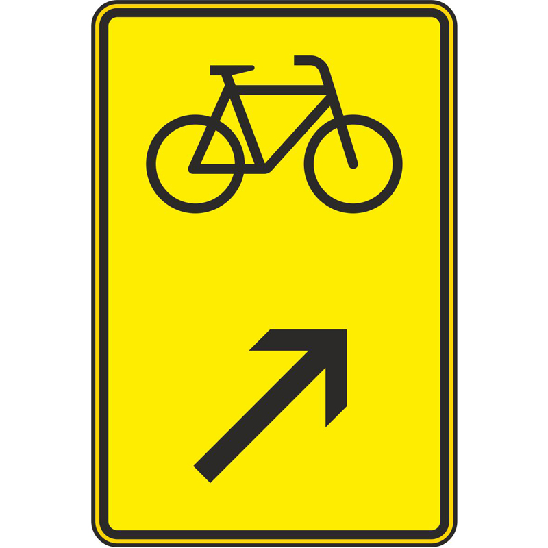 Das Verkehrszeichen 422-27 „Wegweiser für Radverkehr, rechts einordnen“ ist ein gelbes Rechteckschild mit schwarzer Beschriftung. Oben ist das Piktogramm eines Fahrrads, unten ein diagonal nach rechts oben gerichteter Pfeil dargestellt. Das Schild wird aufrecht montiert.