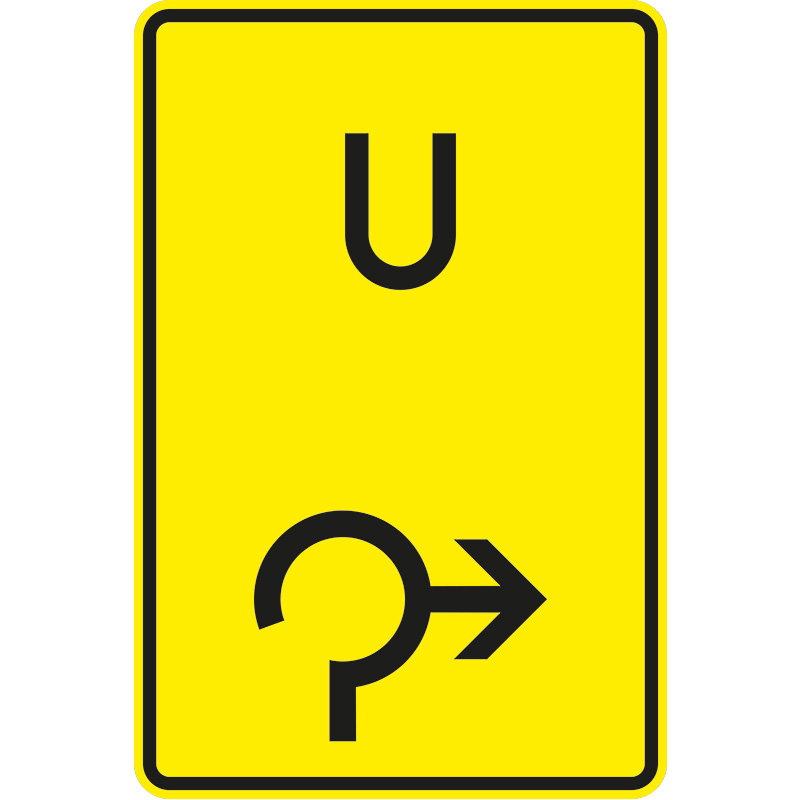 Das Verkehrszeichen 455.1-23 „Ankündigung oder Fortsetzung der Umleitung, im Kreisverkehr rechts“ ist ein Richtzeichen in rechteckiger Form. Auf gelbem Grund sind in Schwarz oben ein „U“ und darunter das Symbol für einen Kreisverkehr mit nach rechts zeigendem Pfeil abgebildet.