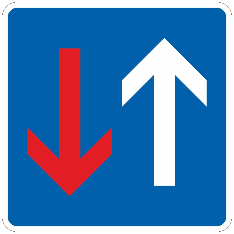 Das Verkehrszeichen 308 „Vorrang vor dem Gegenverkehr“ ist ein quadratisches Verkehrsschild mit zwei Pfeilen auf blauem Grund: Der rote Pfeil links zeigt nach unten, der weiße Pfeil auf der rechten Seite in Fahrtrichtung nach oben.