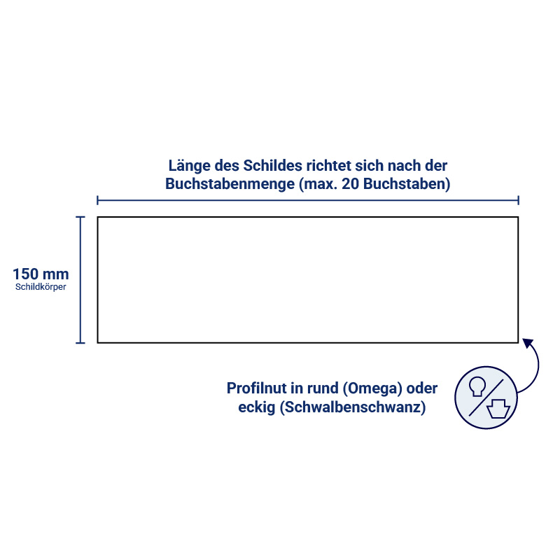 Der Körper des weißen Straßennamenschilds besteht aus einem stabilen, leichten Aluminium Hohlkastenprofil mit 15 x 2 mm (Breite x Wandstärke). Die Profilnut am unteren Rand ist im eckigen Schwalbenschwanz-Profil oder im runden Omega-Profil gefertigt. Sie bildet die Einschubleiste für ein Hausnummernschild oder eine Legendentafel.