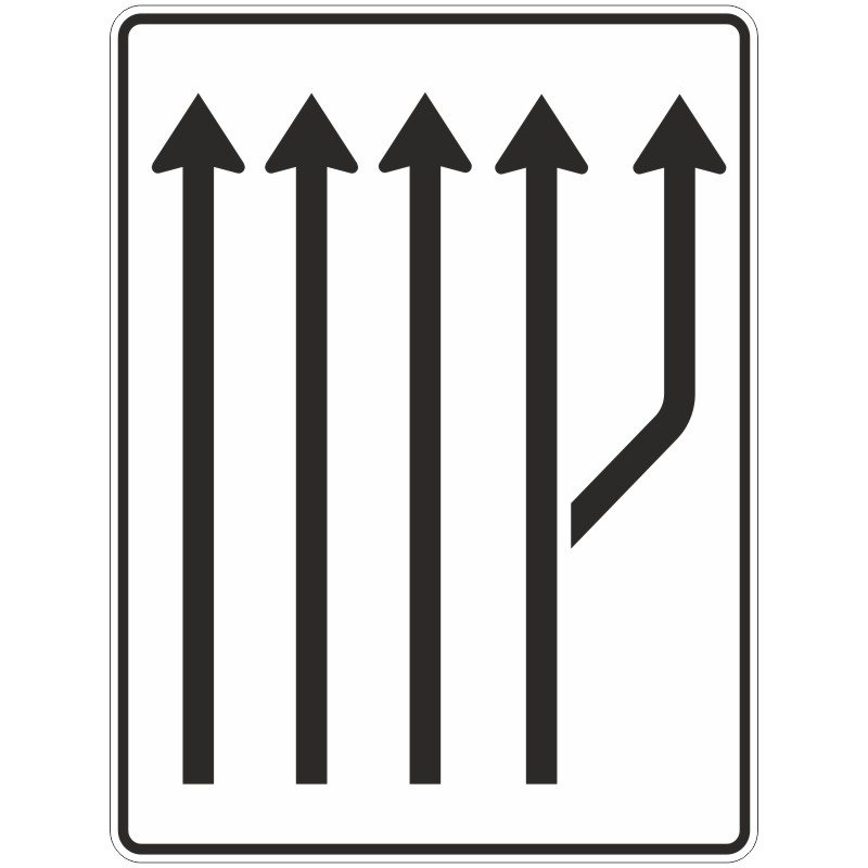 Das Verkehrszeichen 541-23 “Aufweitungstafel ohne Gegenverkehr, 4-streifig plus Fahrstreifen rechts” zeigt auf weißem Grund fünf schwarze Pfeile. Die vier linken Pfeile weisen geradeaus, der rechte geht vom Pfeil daneben ab. Das Rechteckschild wird hochkant montiert.