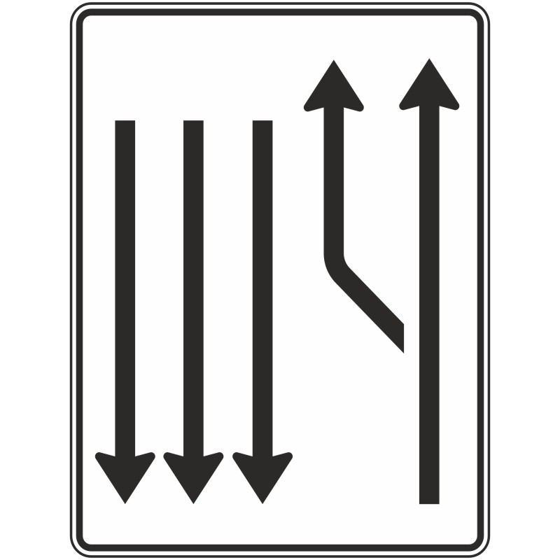 Verkehrszeichen 542-14 Aufweitungstafel mit Gegenverkehr, 1-streifig plus Fahrstreifen links und 3 Fahrstreifen in Gegenrichtung