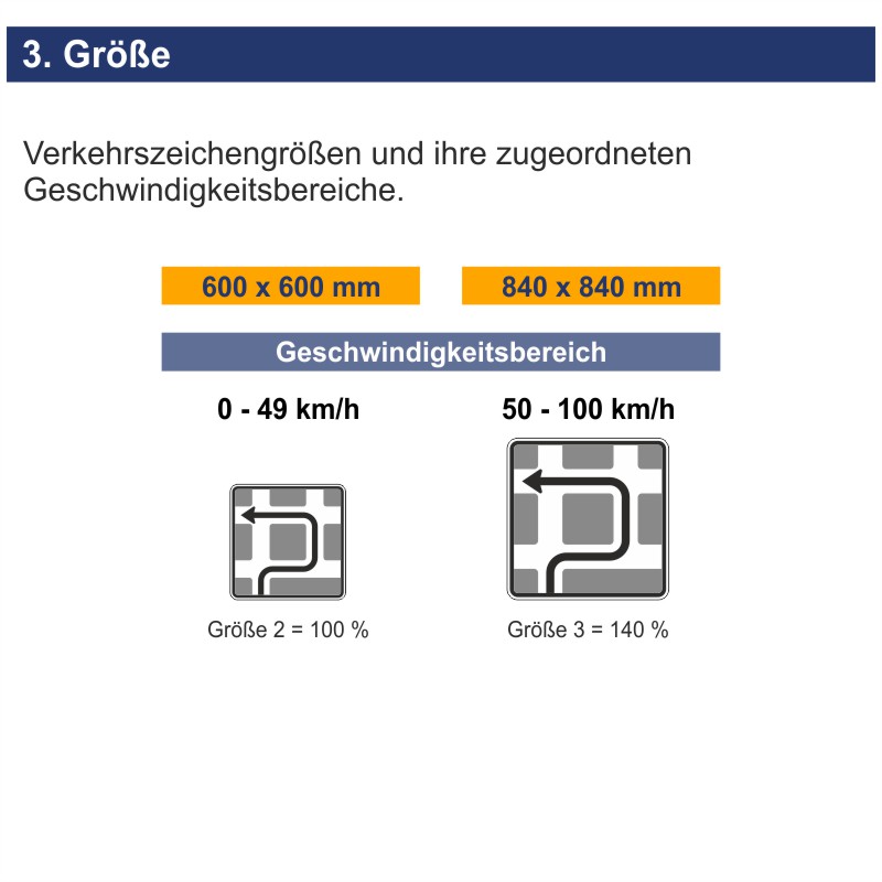 Einsatz: Verkehrszeichen 590-10 kommt in der Regel nur innerorts zum Einsatz. Es zeigt die Ausweichstrecke bei verbotenem oder langwierigem Linksabbiegen und erleichtert so die Orientierung und den Verkehrsfluss.