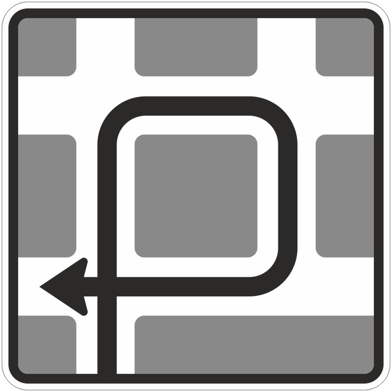 Bedeutung: Das Schild 590-11 bereitet Verkehrsteilnehmer darauf vor, dass im weiteren Verlauf der Straße das Linksabbiegen verboten ist oder im Interesse des Verkehrsflusses umgangen werden sollte. Stattdessen sollte dreimal rechts abgebogen werden, um einen Häuserblock zu umfahren und die gewünschte Straße zu erreichen.