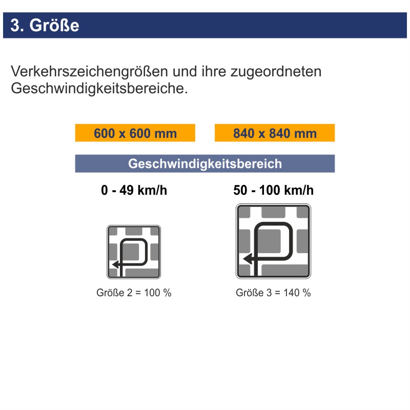 Einsatz: Verkehrszeichen 590-11 kommt in der Regel nur innerorts zum Einsatz. Es zeigt die Ausweichstrecke bei verbotenem oder langwierigem Linksabbiegen und erleichtert so die Orientierung und den Verkehrsfluss.