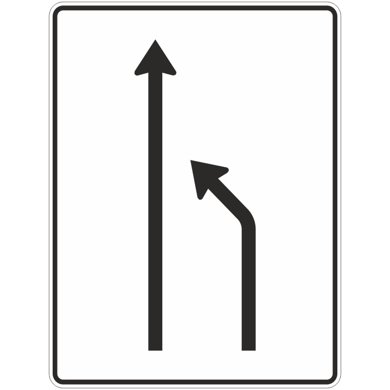 Das Verkehrszeichen 531-10 “Einengungstafel ohne Gegenverkehr, Einzug rechts, von 2 auf 1 Fahrstreifen” zeigt auf weißem Grund zwei schwarze Pfeile. Der linke Pfeil weist geradeaus, der rechte knickt nach links ab. Das Rechteckschild wird hochkant montiert.