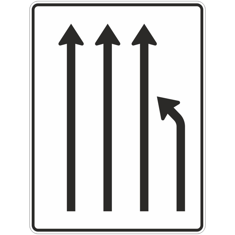 Das Verkehrszeichen 531-12 “Einengungstafel ohne Gegenverkehr, Einzug rechts, von 4 auf 3 Fahrstreifen” zeigt auf weißem Grund vier schwarze Pfeile. Die drei linken Pfeile weisen geradeaus, der rechte knickt nach links ab. Das Rechteckschild wird hochkant montiert.