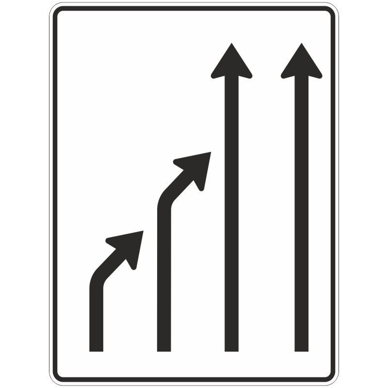 Bedeutung: Das Schild 531-25 bereitet Verkehrsteilnehmer darauf vor, dass die beiden linken Fahrstreifen demnächst enden, der äußere zuerst. Die Fahrzeuge müssen rechtzeitig auf eine der rechten Spuren wechseln.