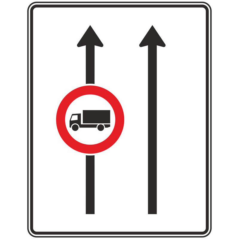 Bedeutung: Das Schild 524-30 zeigt Verkehrsteilnehmern den Verlauf und die Anzahl aller vorhandenen Fahrstreifen. In diesem Fall gibt es zwei Fahrstreifen in Fahrtrichtung. Auf der linken Spur gilt ein Verbot für Kraftfahrzeuge über 3,5 t.
