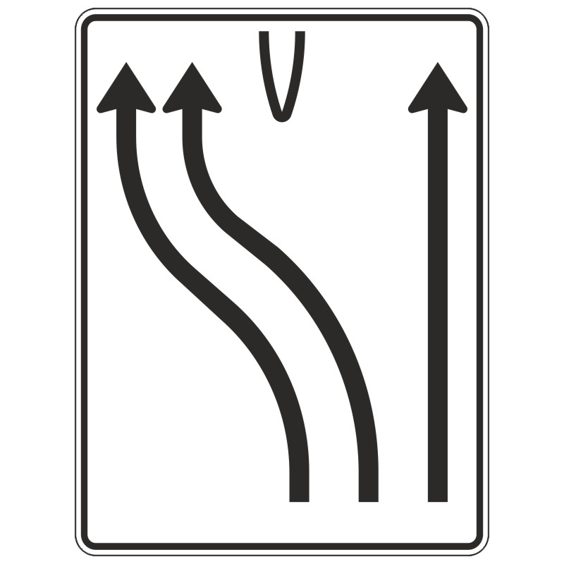 Verkehrszeichen 501-18 Überleitungstafel ohne Gegenverkehr, 3-streifig, davon die beiden linken Fahrstreifen nach links übergeleitet und rechter Fahrstreifen geradeaus