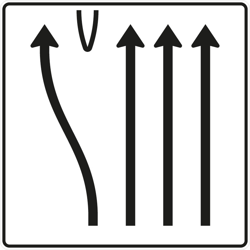 Verkehrszeichen 501-19 Überleitungstafel ohne Gegenverkehr, 4-streifig, davon linker Fahrstreifen nach links übergeleitet und die 3 rechten Fahrstreifen geradeaus