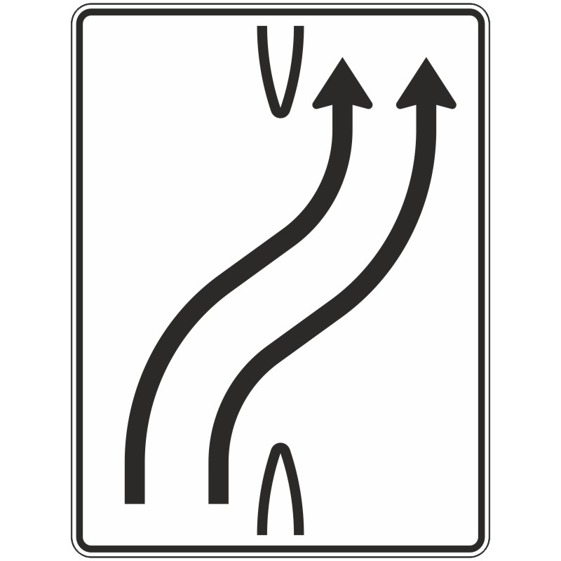 Bedeutung: Das Schild 501-21 bereitet Verkehrsteilnehmer darauf vor, dass die beiden Fahrstreifen ihrer Fahrtrichtung demnächst nach rechts übergeleitet werden. In der Regel handelt es sich dabei um die Rückleitung von Fahrstreifen, die zuvor auf die Gegenfahrbahn geleitet wurden.