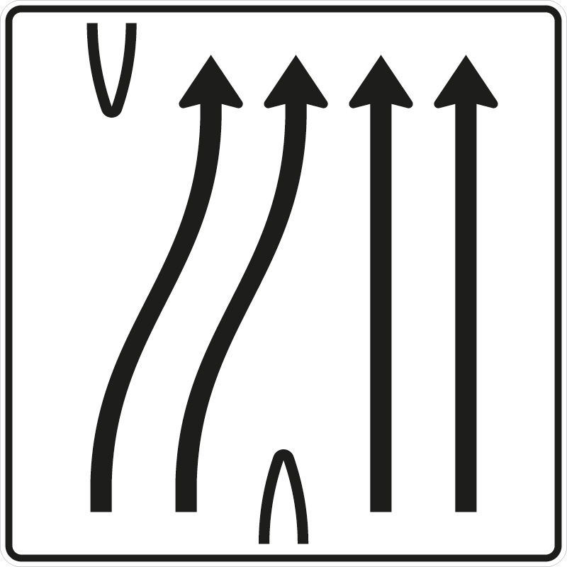 Verkehrszeichen 501-60 Überleitungstafel ohne Gegenverkehr, 4-streifig, davon die beiden linken Fahrstreifen nach rechts übergeleitet und die beiden rechten Fahrstreifen geradeaus