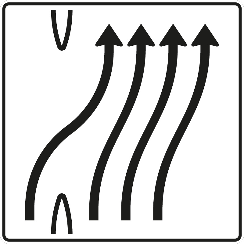 Das Verkehrszeichen 501-62 “Überleitungstafel ohne Gegenverkehr, 4-streifig nach rechts, davon 1 Fahrstreifen übergeleitet” zeigt auf weißem Grund vier nach rechts geschwungene schwarze Pfeile. Ober-und unterhalb des linken Pfeils ist eine Fahrbahntrennung angedeutet.