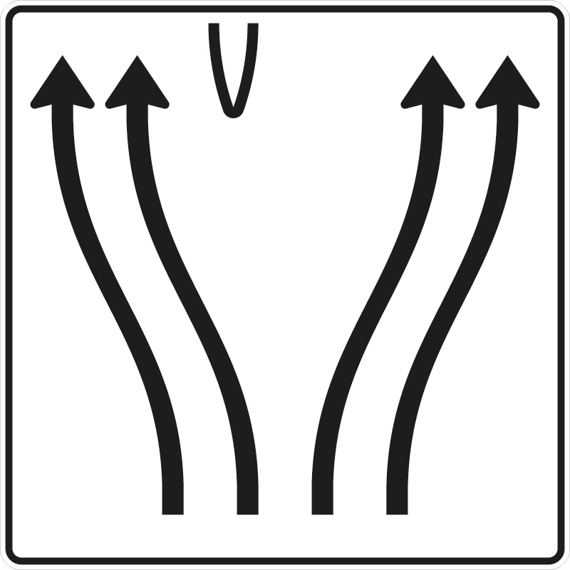 Verkehrszeichen 501-74 Überleitungstafel ohne Gegenverkehr, 4-streifig, davon die beiden linken Fahrstreifen nach links übergeleitet und die beiden rechten Fahrstreifen nach rechts verschwenkt