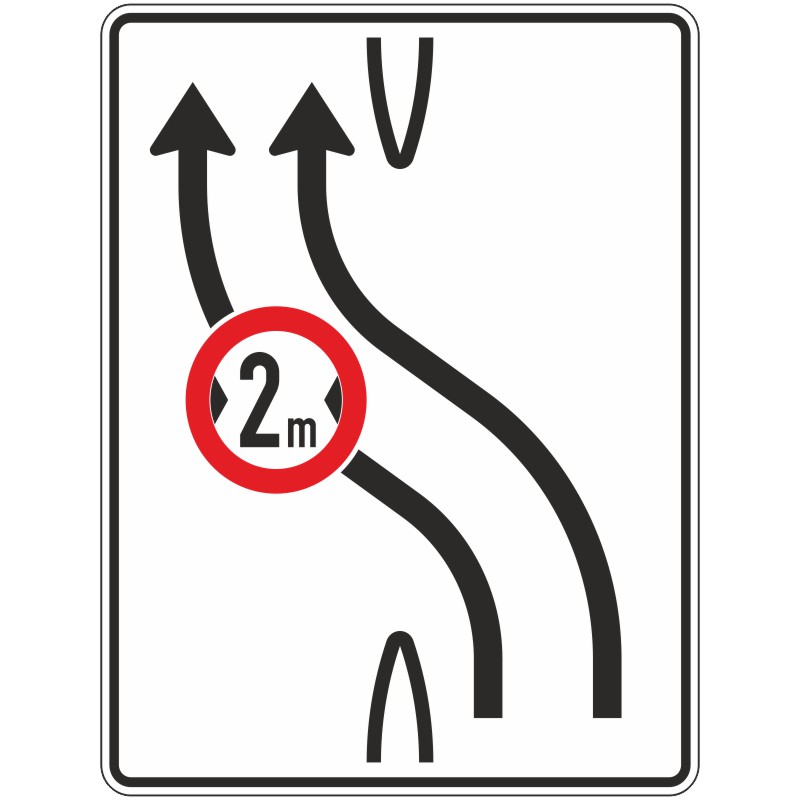 Bedeutung: Das Schild 505-11 bereitet Verkehrsteilnehmer darauf vor, dass beide Fahrstreifen demnächst auf die Gegenfahrbahn übergeleitet werden. VZ 264 beschränkt die Nutzung des linken Fahrstreifens auf Fahrzeuge mit einer Breite von höchstens 2 m.