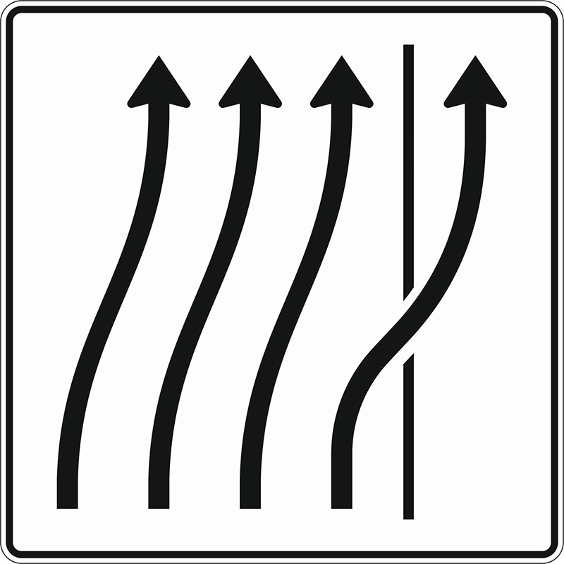 Verkehrszeichen 511-28 Verschwenkungstafel ohne Gegenverkehr, 4-streifige Verschwenkung, 1-streifig auf den Seitenstreifen