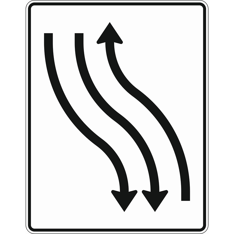 Verkehrszeichen 512-11 Verschwenkungstafel mit Gegenverkehr, Verschwenkung nach links 1-streifig in Fahrtrichtung und 2-streifig in Gegenrichtung