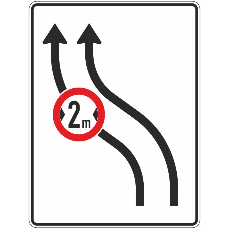 Bedeutung: Das Schild 515-11 bereitet Verkehrsteilnehmer darauf vor, dass beide Fahrstreifen ihrer Fahrtrichtung demnächst nach links verschwenkt werden. VZ 264 beschränkt die Nutzung des linken Fahrstreifens auf Fahrzeuge mit einer Breite von höchstens 2 m.