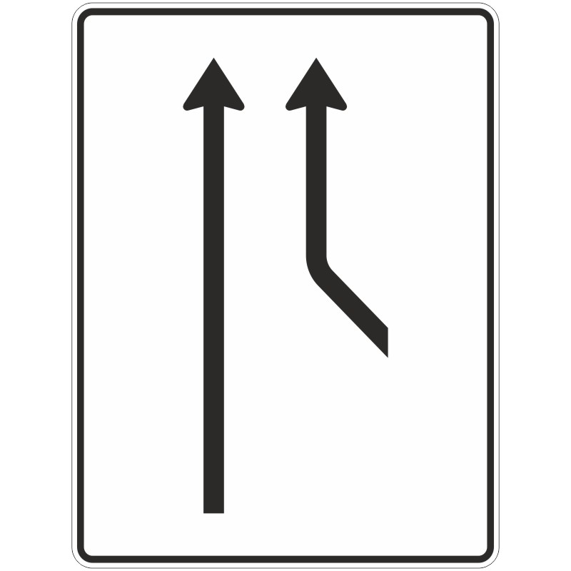 Das Verkehrszeichen 550-20 “Zusammenführungstafel, an durchgehender Strecke, 1-streifig plus 1 Fahrstreifen von rechts” zeigt auf weißem Grund zwei schwarze Pfeile. Der linke Pfeil weist geradeaus, der rechte knickt von rechts nach oben ab. Das Rechteckschild wird hochkant montiert.