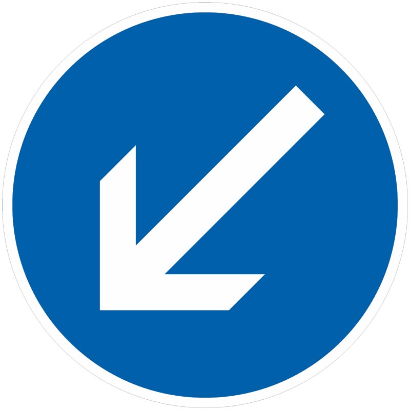 Das Verkehrszeichen 222-10 „Vorgeschriebene Vorbeifahrt links vorbei“ ist ein Gebotsschild nach StVO in runder Form (Ronde) mit blauem Grund und einem weißen Pfeil, der nach links unten zeigt.