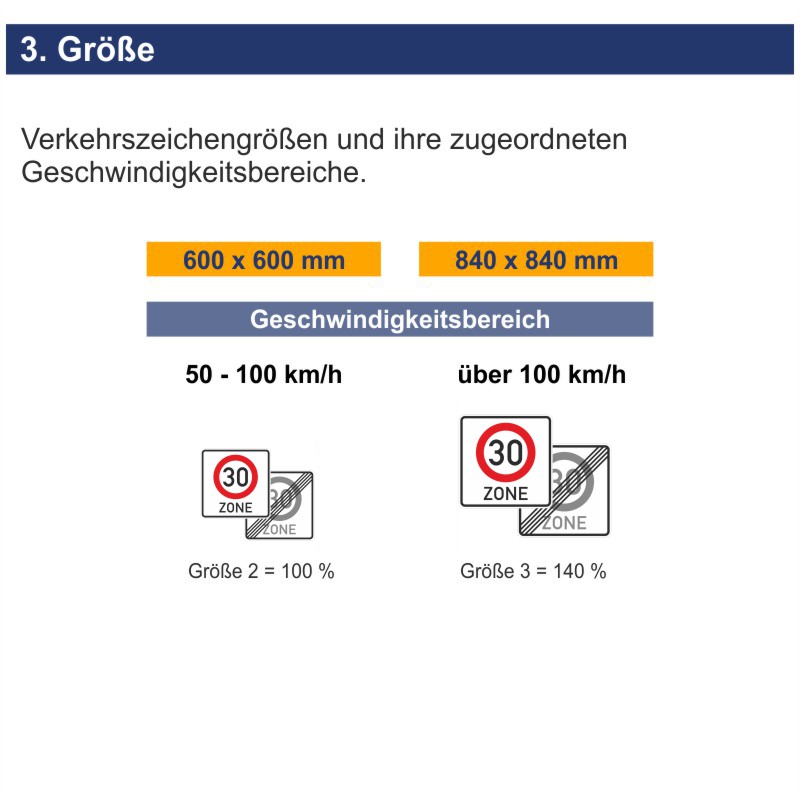 Einsatz: VZ 274.1-40 kennzeichnet mit seinen beiden Seiten den Beginn bzw. das Ende einer Zone, in der Tempo 30 als Höchstgeschwindigkeit für Fahrzeuge gilt. Abseits von Hauptverkehrsstraßen können Bereiche als Tempo 30-Zonen ausgewiesen werden. Hier soll der Fließverkehr besonders viel Rücksicht auf die übrigen Verkehrsteilnehmenden und auf die Anwohnerschaft nehmen. Die doppelseitige Ausführung ist zur Anwendung empfohlen, sofern die Tempo-30-Zone nicht an eine Fußgänger- oder Fahrradzone, eine Fahrradstraße oder einen verkehrsberuhigten Bereich grenzt. Dort sollen am Übergang die entsprechenden Zeichen zur Einfahrt in den nachfolgenden Bereich stehen. Das Zeichen 274.1-40 ist so anzubringen, dass es rechtzeitig wahrgenommen wird; an Einmündungen oder Kreuzungen kann eine beidseitige Aufstellung sinnvoll sein. Weitere Verkehrszeichen mit einer Begründung für die Geschwindigkeitsbeschränkung in der Zone sind nicht erlaubt. Mit dem Zeichen 274.1-40 können in verkehrsberuhigten Geschäftsbereichen auch Tempobegrenzungen von weniger als 30 km/h in der Zone signalisiert werden.