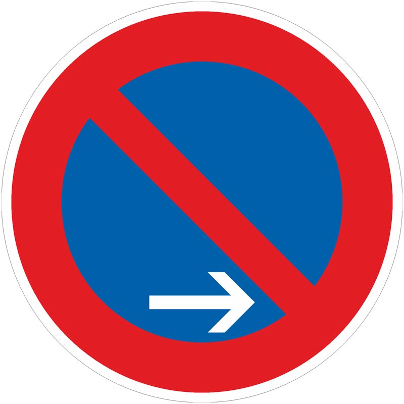 Das Verkehrszeichen 286-20 „Eingeschränktes Halteverbot Ende, Aufstellung rechts“ ist ein Verkehrsschild in runder Form. Es hat eine rote Umrandung und einen blauen Grund, durch den diagonal ein roter Balken verläuft. Der weiße Pfeil im unteren Schildbereich zeigt nach rechts von der Fahrbahn weg.