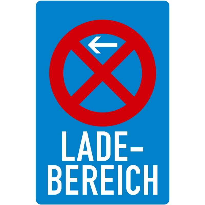 Das Verkehrszeichen 230-10 “Ladebereich Anfang, Aufstellung rechts” ist ein rechteckiges Schild mit blauem Grund. Oben befindet sich ein rotes Halteverbotssymbol mit weißem Pfeil im oberen Viertel, der nach links zeigt. Darunter steht die weiße Aufschrift “LADEBEREICH”.