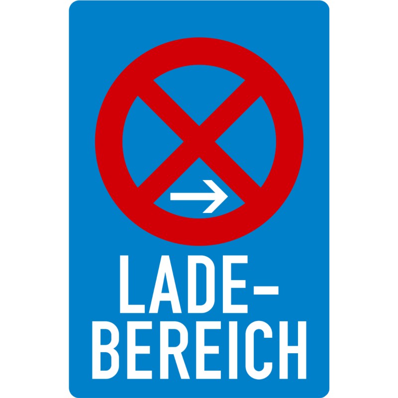 Das Verkehrszeichen 230-20 “Ladebereich Ende, Aufstellung rechts” ist ein rechteckiges Vorschriftszeichen mit blauem Grund. Oben befindet sich ein rotes Halteverbotssymbol mit einem weißen, rechts gerichteten Pfeil im unteren Viertel. Darunter steht in Weiß “LADEBEREICH”.